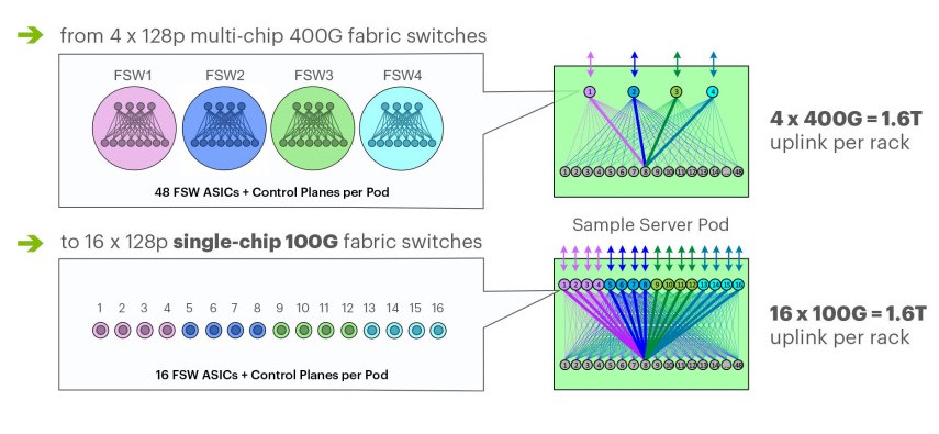 With the new F16 fabric, the once-modern fabric that was first deployed in 2014 in Facebook’s Altoona, Iowa, called simply Data Center Fabric, is being deprecated and is now referred to as the Classic Fabric. The F16 fabric gets around some of the limitations of the Classic Fabric, and a lot of those limitations really come from being able to pump four times as many 100 Gb/sec pipes out of a switch port as was possible at an affordable price and within a certain thermal envelope more than four years ago. At that time, Facebook was using 100 Gb/sec switching sparingly, for the network backbone across datacenters in a region and as the backbone between regions, with 40 Gb/sec networking at the leaf and spine layers down to the servers and storage servers that support its applications.