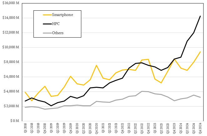 For a long time, the smartphone drove more revenues – and certainly a lot more volumes – than this so-called HPC business at TSMC, but that is no longer true and it very likely will never be true again. That HPC platform as described above had revenues of $14.29 billion in Q4 2024, up 68.9 percent year on year and there is every reason to believe that AI system sales will continue to drive it higher and higher into 2025 and beyond thanks to the demand for compute, acceleration, and networking. This marketed the third quarter in a row when HPC chip manufacturing, packaging, and testing drive more than half of TSMC’s revenues. Smartphones, by contrast, pushed a little more than a third of TSMC’s sales in the December quarter, up a GDP-beating 11.5 percent to $9.41 billion.