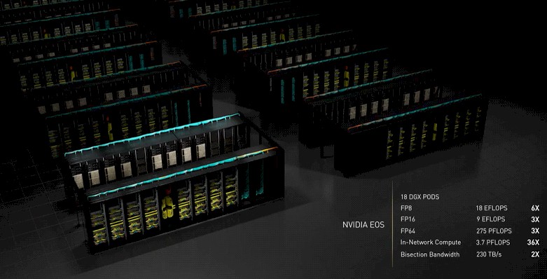 Nvidia will be building a follow-on to its existing “Selene” supercomputer based on all of this technology, to be called “Eos” and expected to be delivered in the next few months, according to Jensen Huang, Nvidia’s co-founder and chief executive officer. This machine will weigh in at 275 petaflops at FP64 precision and 18 exaflops at FP8 precision, presumably with sparsity support doubling the raw metrics for both of these precisions.