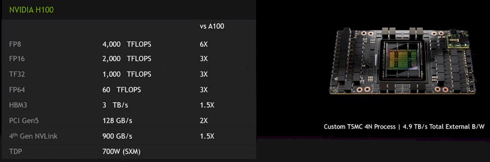 The combination of this Transformer Engine inside the Tensor Cores as well as the use of FP8 data formats (in conjunction with FP16 and TF32 formats still needed for AI training, as well as the occasional FP64 for that matter), the performance of these transformer models has increased by a factor of 6X over what the Ampere A100 can do.
