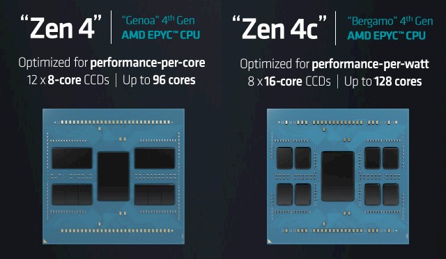 Because the Zen 4c cores are 35 percent smaller, AMD can cram more of them into an Epyc server socket. But AMD didn’t just cram more cores into the dozen compute complexes that are used on the biggest of the Genoa Epyc 9004 series processors. Rather, it reduced the number of compute cores dies, or CCDs, on the Bergamo chip from twelve to eight and jacked up the core counts on each CCD from 8 cores to 16 cores. This means the number of domains is smaller even as the core count increased from 96 cores to 128 cores on the package.