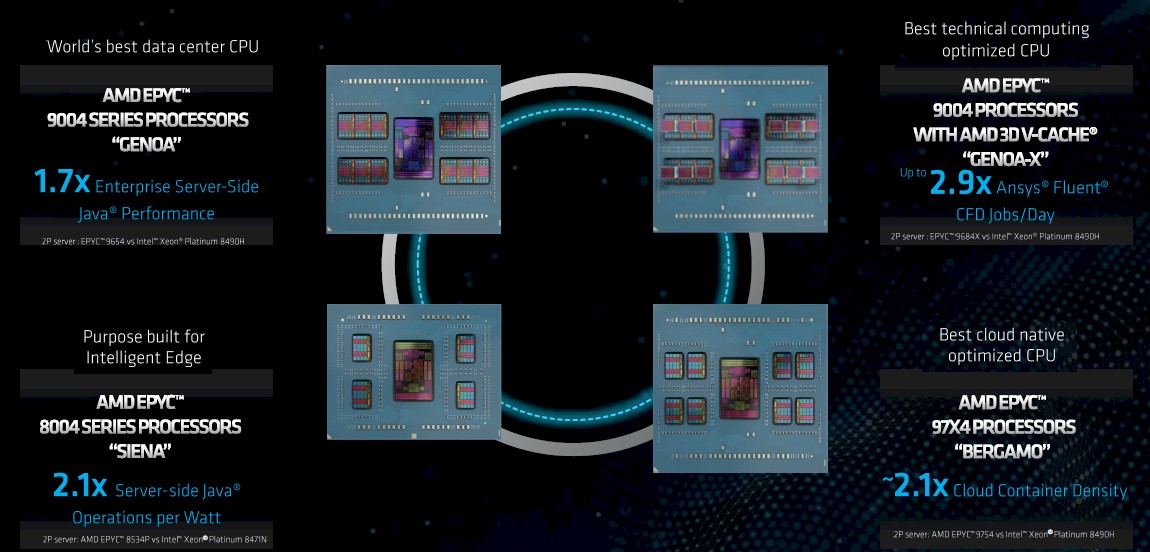 This composite chart sums up the positioning of the four different Genoa-class AMD CPUs and how they compare to each other and Intel equivalents pretty succinctly: