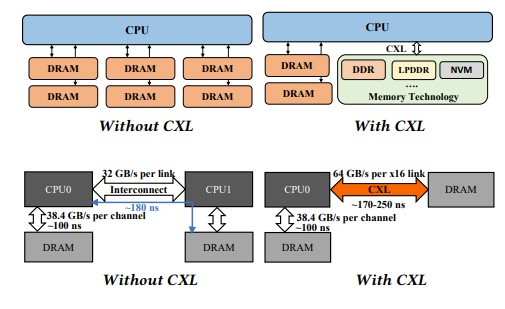 So we are basically having to move main memory to the PCI-Express bus, using the CXL protocol overlay, to expand the memory capacity and memory bandwidth in the system in a way that doesn’t add more memory controllers onto the CPU dies. There is a little bit of a latency delay in this memory, as you can see in the chart below, but it is on the same order of magnitude as a NUMA link between two CPUs in a shared memory system: