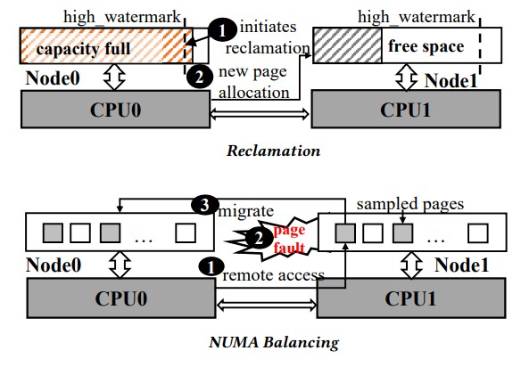 Meta Platforms tried to use the NUMA balancing algorithms in the Linux kernel (also sometimes called AutoNUMA) to balance memory pages across regular DDR main memory and CXL main memory, and also analyzed the memory page reclamation technique in the Linux kernel. The basic workings of these processes are shown here: