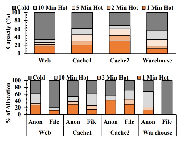 The top set of charts shows the levels of heat on the data by workloads, and obviously, the colder the data, the more reasonable it is to move it to CXL memory. Now, there are two different kind of memory page types in the top set of charts, and the bottom set shows the heat distribution for anonymous and file pages. Anon pages tend to stay hotter than file pages, and Meta Platforms says that applications tend to have a fairly steady memory usage pattern, with some variance. These factors are also important to know.