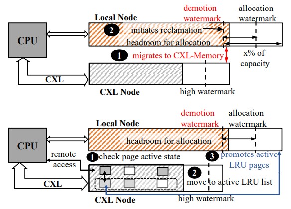 Basically, Linux tries to allocate data for processing as close to the CPU that is going to be doing the processing, but there is always contention and sometimes it has to be pushed out to adjacent NUMA regions where another CPU has the memory attached. Data is shuffled around, with hot data for each CPU kept as close to that CPU and pushed out to others. Linux allocated pages for CPUs, and when it gets under pressure, it pushes data to other regions and reclaims memory capacity as applications need memory space. Sometimes this can strand hot data out in a different NUMA region, casual extra latency and application performance degradation. This paging mechanism, therefore, is not really good for CXL memory.