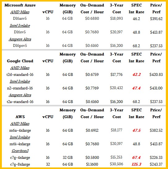 Ultimately, what everyone wants to know is how the Arm server slices sold by the big three clouds in the United States and Europe compare to each other and to the X86 instances most similar to them from Google, Microsoft, and AWS. So we ginned up this little table, based on the performance information given by Microsoft Azure for its instance comparisons back in April. We extended this to cover the most similar instances for Google Cloud and AWS. Take a look: