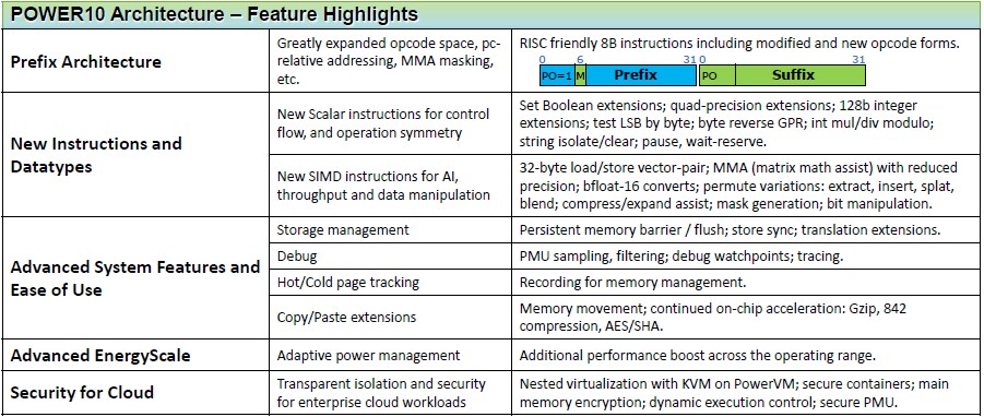 The Power10 core adheres to the new Power instruction set version 3.1, which was open sourced under the OpenPower Foundation last August. The Power10 core has over 200 new instructions that have been added, according to Thompto, and these are aimed at making the microarchitecture more efficient at certain functions as well as adding new functions. Here is a breakdown of the important new instructions and data formats supported in the Power10 core: