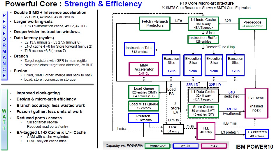 This is only showing half of the SMT8 setup, which would be hard to draw and which is equivalent to the SMT4 core. You can see the four 128-bit execution slices at the heart of the system, which is front-ended by a 48 KB L1 instruction cache and backended by a 32 KB L1 data cache. A lot of the features of this Power10 core are 2X or 4X that of the Power9 core, as you can see, although some are only moderately improved. Add it all up, and the SMT8 core yields 30 percent more work on average and thanks to the design, the process shrink from 14 nanometer processes from GlobalFoundries used with Power9 to the 7 nanometer processes from Samsung (which have some extra IBM goodies baked in and are not just Samsung’s V1 process), the power consumption per core has been cut in half. That’s a factor of 2.6X improvement in performance per watt, which sounds like a lot between generations but you have to remember there will be almost four years between the Power9 and Power10 generations, too.