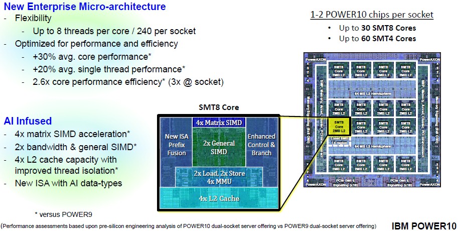 I’m looking at the official IBM press release in which it details the footnote on comparing Power10 to Power9 with the phrase “3X performance is based upon pre-silicon engineering analysis of Integer, Enterprise and Floating Point environments on a POWER10 dual socket server offering with 2×30-core modules vs POWER9 dual socket server offering with 2×12-core modules.” My reasoning says