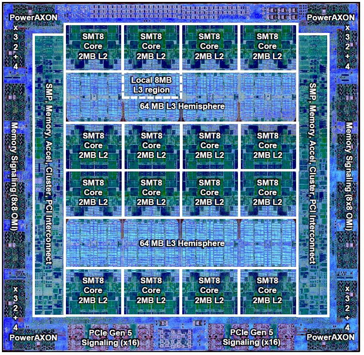 Having talked about the performance of that socket above, we should probably have a look at the socket. So here is the Power10 die, hardened into SMT8 mode, with its features labeled: