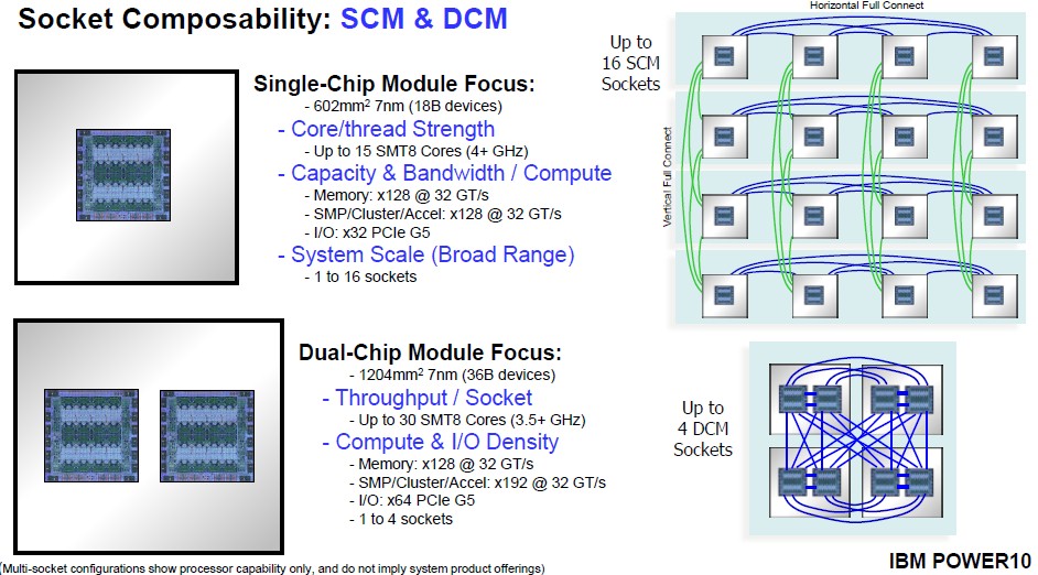 Rather, IBM went all the way back to the drawing board and created a chip that had had 16 SMT8 cores or 32 SMT4 cores and it also went with a dual-chip module option to double up the number of cores with a modest decrease in clock speed on the cores and still keep within the thermal envelope it sets for its own Power Systems. So it can deliver either 30 fat or 60 skinny Power10 cores in a socket, with a total of 240 threads per socket.
