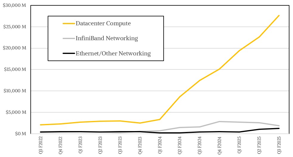 As shown above, the compute part of the datacenter pie still dominates and reflects the level of investment in HPC/AI supercomputers when it comes to compute and networking. In the quarter, compute drove $27.64 billion in revenues, up 2.2X year on year and up 22.3 percent sequentially. Networking was up 51.8 percent to $3.13 billion, but fell 14.7 percent sequentially. Our model shows InfiniBand sales were up only 15.2 percent year on year and actually fell by 27.3 percent sequentially, and accounted for $1.87 billion. Ethernet networking, which is driven mostly by some big Spectrum-X clusters like the one installed by xAI in its Memphis datacenter to lash together 100,000 H100 GPUs, nearly tripled in the quarter and Spectrum-X for AI sales more than tripled. We think that works out to $1.26 billion in sales for all Ethernet products in Q3 F2025.