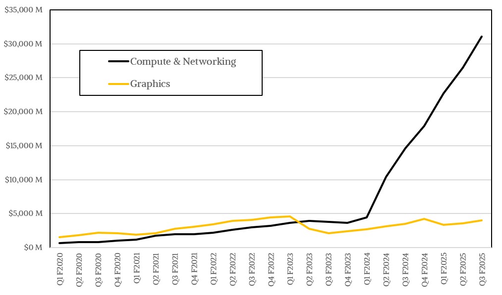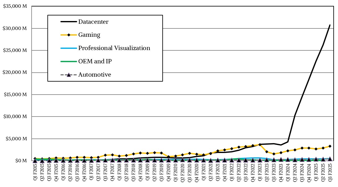 In the October quarter, Nvidia’s gaming card revenues – remember when Nvidia was a gaming company with a tiny datacenter business? – was $4.05 billion, up 16.4 percent. The vast majority of its revenues, in this case $31.04 billion and up by a factor of 2.1X year on year and up 17.4 percent sequentially, came from its Compute & Networking group.