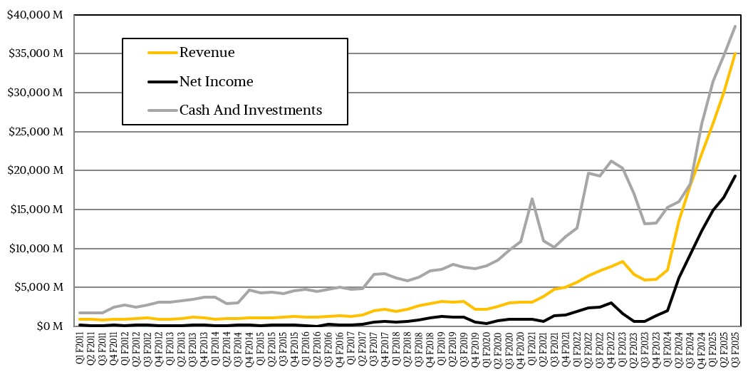 In the quarter, Nvidia had total sales of $35.01 billion, up 93.6 percent from the year ago quarter, with operating income up 89.2 percent to $21.87 billion and net income up 108.9 percent to $19.31 billion. Despite ongoing investments in research and development, share buybacks, and higher general costs, Nvidia was still able to end the quarter with $38.49 billion in cash in the bank. That cash hoard is up $3.69 billion from the prior quarter and up by more than 2X since this time last year.