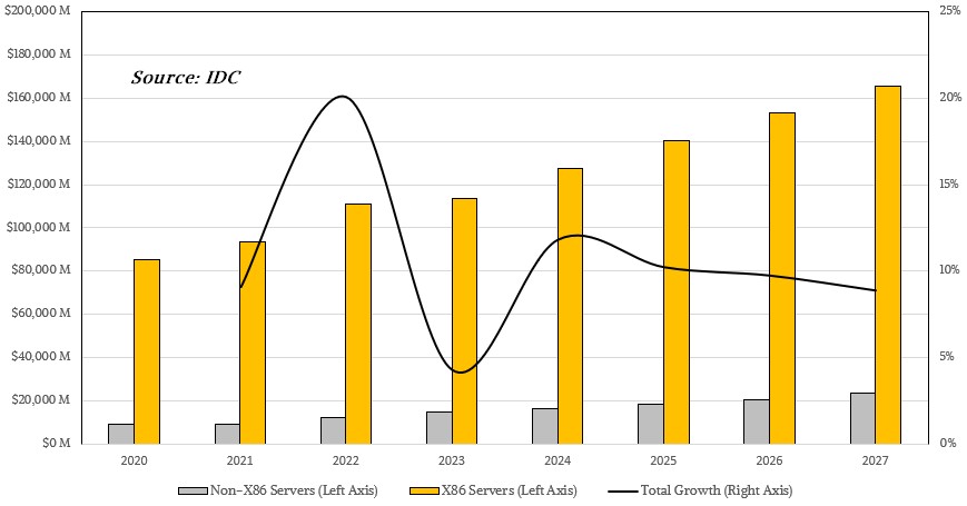 Here is the IDC chart, which shows worldwide server revenue data from 2022 and the forecast for 2023 through 2027: