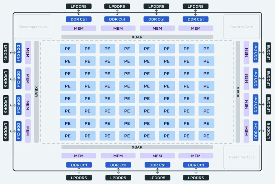 The basic layout of the MTIA v2 is very similar to the MTIA v1. Both have a total of 64 PEs, which are wrapped on all sides with a crossbar fabric that links the PEs to DDR5 memory controllers, four on each side for a total of sixteen memory channels. Meta, like Nvidia with its “Grace” CG100 Arm server CPUs, has opted to use the LPDDR5 memory commonly used in laptops. (The LP is short for low power.) With the MTIA v1, the off-chip LPDDR5 memory weighed in at 64 GB of capacity and 176 GB/sec of bandwidth across those sixteen channels. With the MTIA v2, the capacity is doubled to 128 GB and the memory speed is goosed by 16.4 percent, which boosts the bandwidth by the same amount to 204.8 GB/sec.
