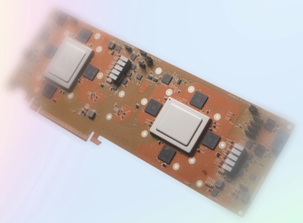 The MTIA v2 has a PCI-Express 5.0 x8 controller with 64 GB/sec of bandwidth to connect to hosts through a PCI-Express switched fabric, and the MTIA v1 had a PCI-Express 4.0 x8 controller with 32 GB/sec of bandwidth. With the MTIA v1 cards, there was one chip per card, but with the MTIA v2, there are two chips per card and they share a physical PCI-Express 5.0 x16 connector to attach to a host. Like this: