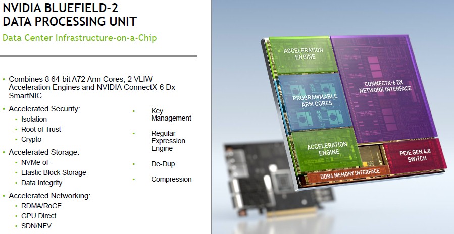 The BlueField-2 DPU includes eight 64-bit Armv8 Cortex-A72 cores for local compute as well as two acceleration engines, a PCI-Express 4.0 switch, a DDR4 memory interface, and a 200 Gb/sec ConnectX-6dx network interface controller. That NIC interface can speak 200 Gb/sec Ethernet or 200 Gb/sec InfiniBand, as all Nvidia and prior Mellanox NICs for the past many generations can. That PCI-Express switch is there to provide endpoint and root complex functionality, and we are honestly still trying to sort out what that means.