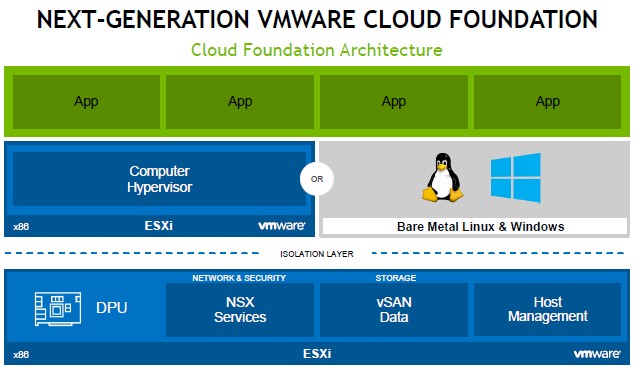 With the launch of the ESXi 8 hypervisor and its related vSphere 8 management tools, Nvidia and VMware have worked to get much of the VMware virtualization stack to run on its Arm-based server cores on the BlueField-2 DPU line, virtualizing cores running on X86 systems that the DPU is plugged into. Conceptually, this next generation of VMware’s Cloud Foundation stack looks like this: