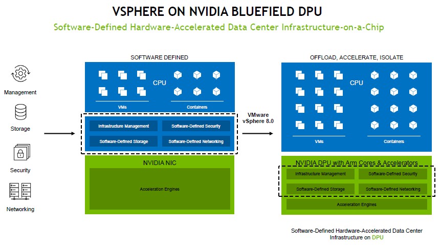 The first of the server makers out the door with the combined VMware stack and Nvidia BlueField-2 is Dell, which has certified configurations of its PowerEdge R650 and R750 rack servers and its VxRAIL hyperconverged infrastructure with the Nvidia DPUs and vSphere 8 preinstalled to offload as much work as possible to those DPUs. These systems will be available in November. Pricing is obviously not available now. Hopefully they will be when they start shipping so we can figure out the real ROI of DPU offload for server virtualization. The numbers matter here. In a way, the ROI will pay for enhanced security for those who have to justify the added complexity and cost. Those who want the enhanced security at nearly any cost won’t care as much about the DPU ROI. The trick for VMware and Nvidia is to price this low enough that it is indeed a no-brainer.