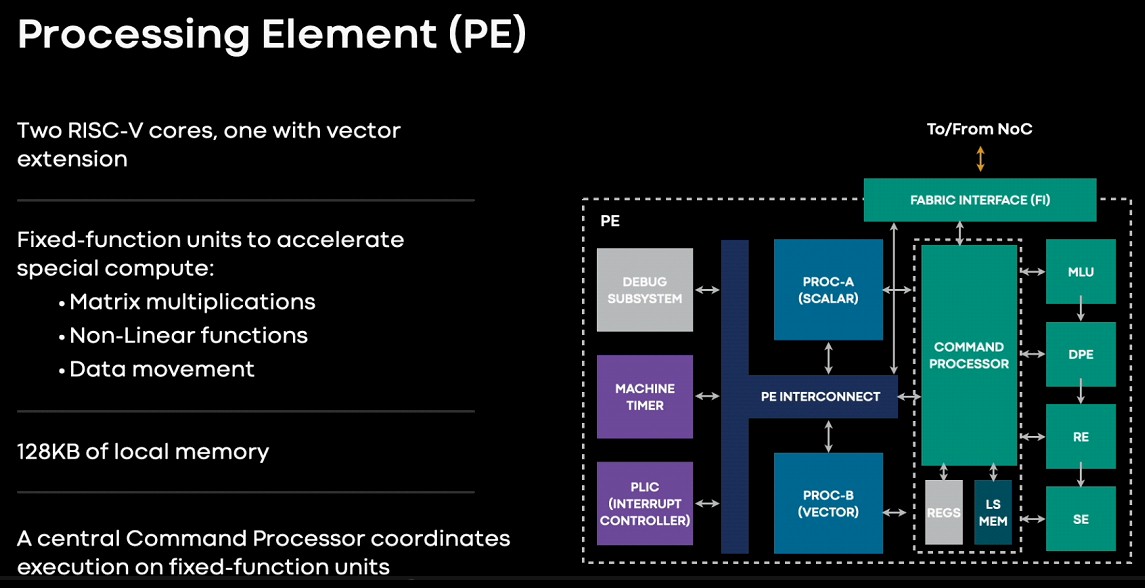 Those 64 processing elements are based on a pair of RISC-V cores, one plain vanilla and the other with vector math extensions. Each processing element has 128 KB of local memory and fixed function units to do FP16 and INT8 math, crank through non-linear functions, and move data.