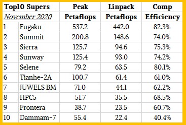 We talked to Jack Dongarra, professor of computer science at the University of Tennessee, the creator of the Linpack linear algebra benchmark, and one of the originators of the Top500 list, about this back in June 2019 when he rolled out the HPL-AI adjunct to the HPL test. The iterative refinement solver allowed the Summit supercomputer, rated at 148.8 petaflops on the real HPL test in 64-bit floating point precision to do the work 2.9X faster using a FP16, FP32, and FP64 math, making it feel like it was a 445 petaflops 64-bit machine. With the Fukagu supercomputer at RIKEN, using this iterative solver method in mixed precision, the slightly smaller system in June was able to behave like it was a 1.4 exaflops 64-bit machine as far as HPL goes, and with the increased core count here in the fall of 2020 and tweaks to the iterative solver used in the HPL-AI test, Fugaku did the work of a hypothetical 2 exaflops machine running in 64-bit mode, which is a factor of 4.5X boost.