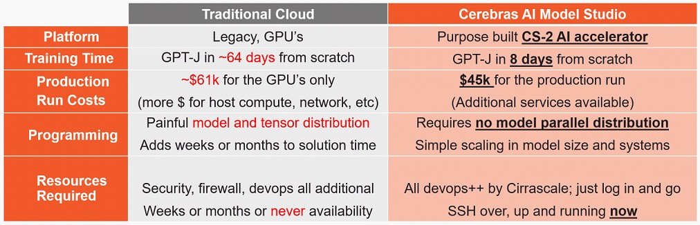 And thus, the central theme of the AI Model Studio coming out of Cerebras and Cirrascale is predictability and not just the vague claim that AI models can run 8X faster and at half the price of using GPUs on Amazon Web Services.