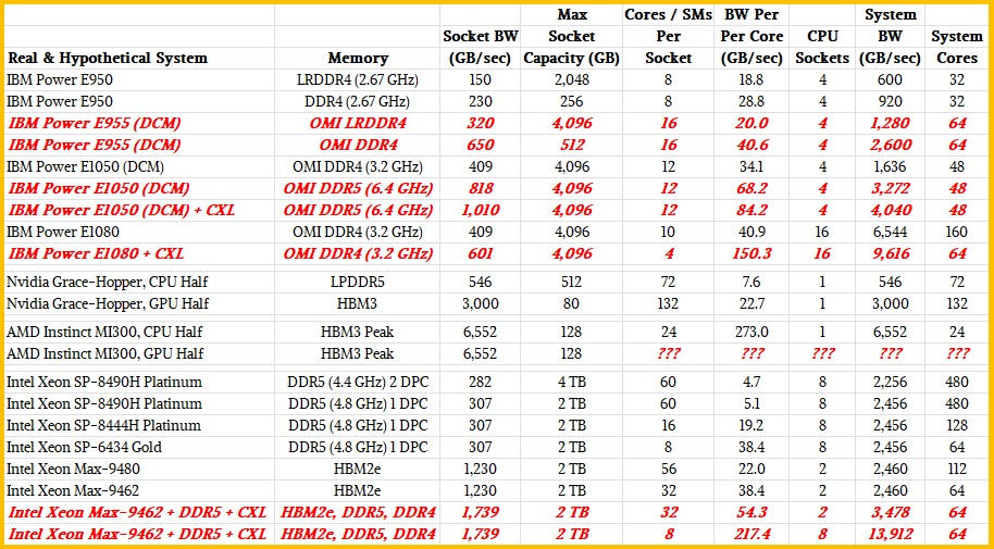 We have been thinking about this for a while, and the preview of the Power10 processor by IBM way back in August 2019 and an expected (but never delivered) high-bandwidth Power9′ – that is Power9 “prime” not a typo – system that Big Blue talked to us about in October 2019 whet our appetite for systems with high memory bandwidth. (Let’s call it the Power E955 so it has a name, even though it was never launched.) IBM was showing off its OpenCAPI Memory Interface (OMI) and the resulting memory it has delivered with the Power10 machinery, but this chart encapsulated what IBM believed it could do on a Power chip socket for various technologies: